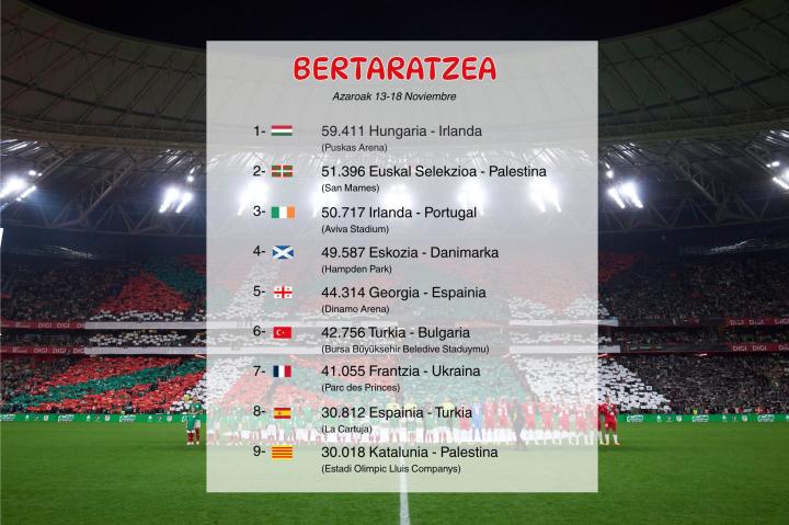 随着本期国际比赛日结束,巴斯克足协统计了本期国际比赛日欧洲区上座人数超过3万人的场次,其中巴斯克代表队的比赛以51396人位列第二,而加泰罗尼亚代表队以30018人位列第九。