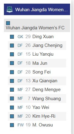 武汉女足首发:29-丁旋、26-姜晨璟、15-刘艳秋、18-马君、28-宋菲、13-徐倩倩、27-邓梦烨、7-王霜、10-姚伟、20-金蕙利、19-马维斯-奥乌苏