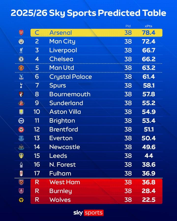在本周末英超战火重燃之前,《天空体育》预测了本赛季英超联赛各球队的最终排名,阿森纳夺冠,曼城、利物浦紧随其后,切尔西排在第四,曼联则在第五。