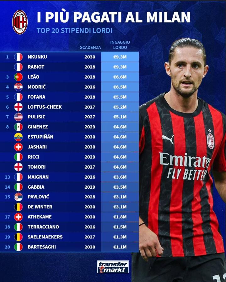 北京时间11月21日,德转统计出了AC米兰本赛季税前年薪排名前20的球员,恩昆库和拉比奥这两位新援同以930万欧元并列第1,莱奥660万欧元第3,莫德里奇650万欧元第4,普利希奇510万欧元队内排名第7,萨勒马克尔斯仅130万欧元队内排名第19位。