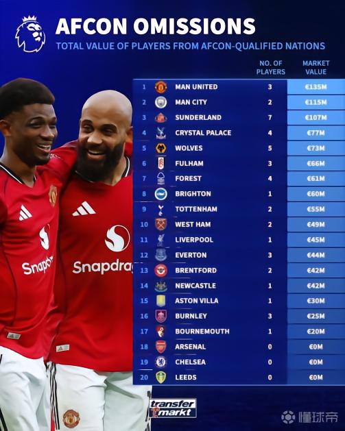 北京时间11月21日,德转列出英超20家俱乐部本届非洲杯晋级国家球员的总身价,曼联3人1.35亿欧元第一,曼城2人1.15亿欧元第二,桑德兰7人1.07亿欧元第三。