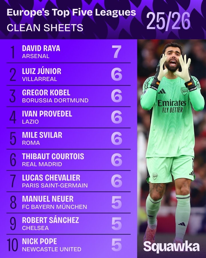 数据统计机构Squawka统计出本赛季截至目前五大联赛门将零封榜,戴维-拉亚7次零封居首。