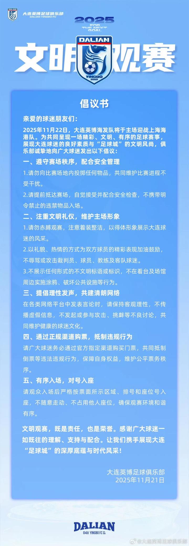 2025年11月22日,大连英博海发队将于主场迎战上海海港队。为共同呈现一场精彩、文明、有序的足球赛事,展现大连球迷的良好素质与 “足球城” 的文明风尚,俱乐部诚挚地向广大球迷发出以下倡议: