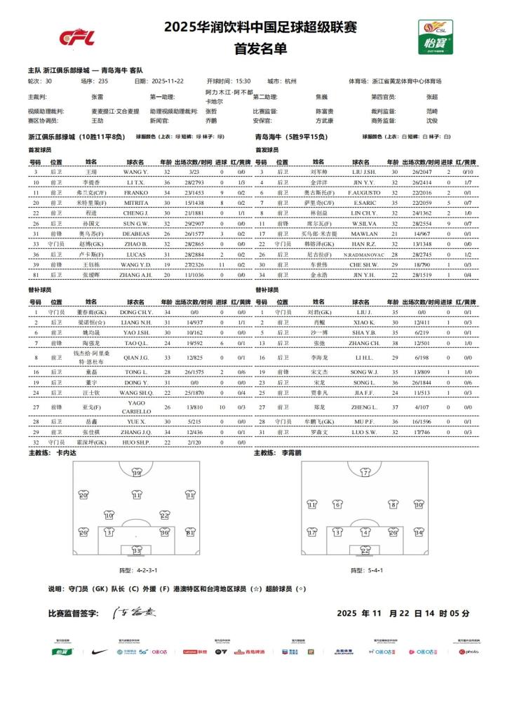 北京时间11月22日15:30,中超第30轮,浙江队主场对阵青岛海牛,本场比赛主裁判是张雷,VAR是麦麦提江,赛前双方公布首发: