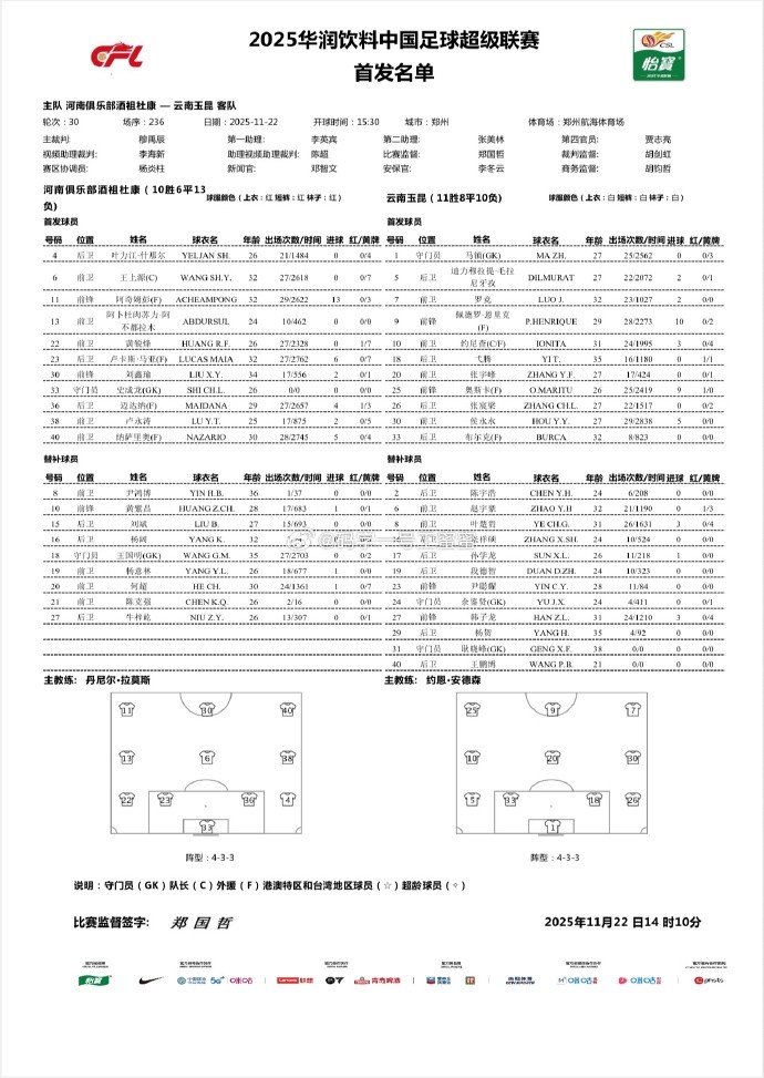 北京时间11月22日15:30,中超第30轮河南坐镇主场郑州航海体育场迎战云南玉昆。本场主裁判为穆禹辰,李海新担任VAR。赛前双方公布首发名单。
