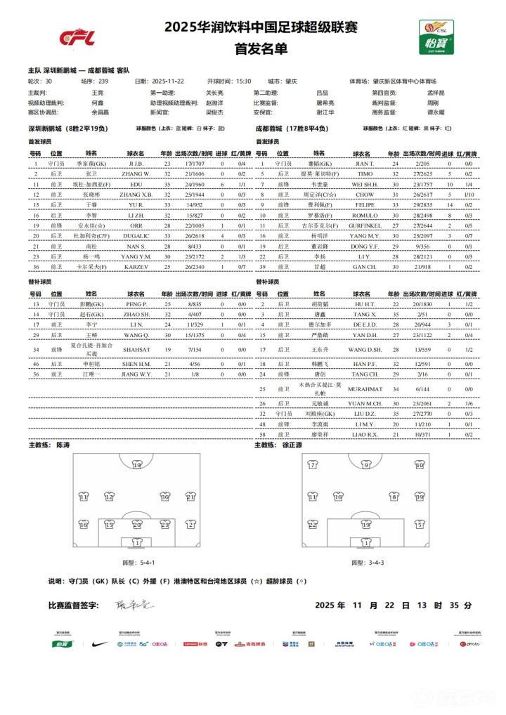 北京时间11月22日15:30,中超第30轮的一场对决。新鹏城坐镇主场,迎战成都。赛前,双方的阵容公布如下: