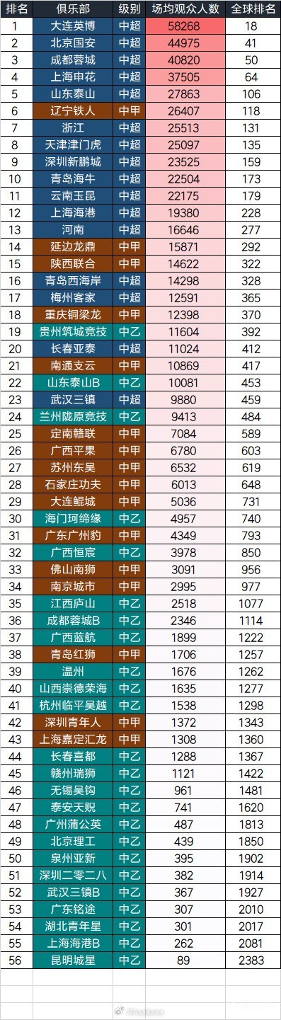 北京时间11月24日,德转中国区的管理员朱艺统计出了2025赛季中国三级职业联赛俱乐部场均观战人数排名,大连英博以场均超5.8万名观众位列第一,世界排名第18位,北京国安约4.5万人第二,成都蓉城超4万人第三。排名垫底的则是中乙俱乐部昆明城星,场均观众仅89人。
