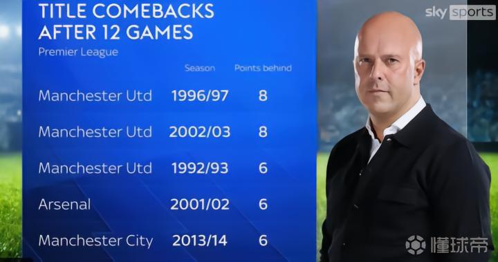 据《天空体育》的数据统计,此前,第12轮落后第一名6分或更多的分还能夺冠的情况,英超历史只出现过5次。