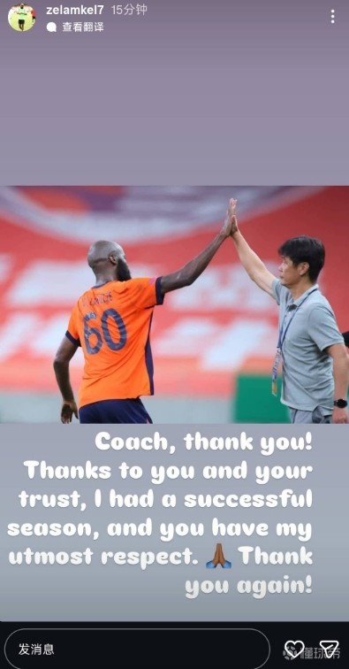 结束本赛季的中超征程后,青岛海牛外援兰克尔-泽在社交媒体里向主教练李霄鹏致谢:“感谢你的信任,我对你怀着最大的敬意。”