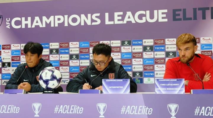11月24日,成都蓉城对广岛三箭的赛前新闻发布会,主教练徐正源和球员提莫出席。