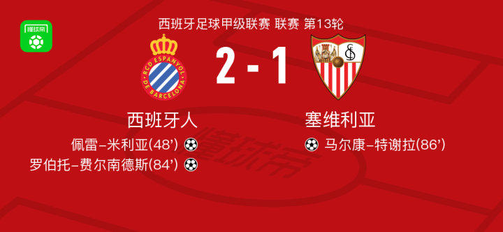 西班牙人2-1塞维利亚,罗伯托-费尔南德斯建功,佩雷-米利亚破门