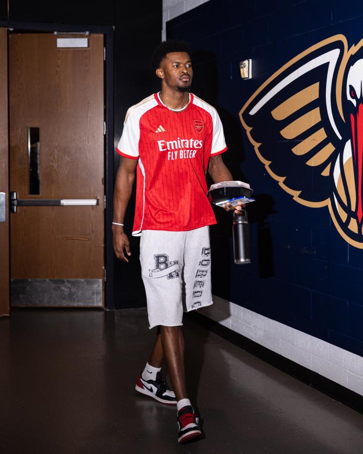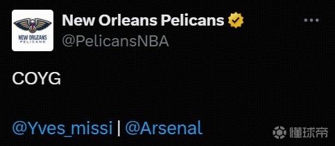 赛前进入球馆时,鹈鹕中锋米西身着阿森纳球衣,鹈鹕官方将这张图发到了官方社媒,配文COYG,并艾特了阿森纳官方账号。