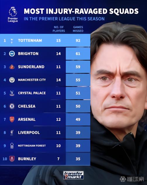 北京时间11月25日,德转统计出了本赛季伤病最多的10支英超球队,托特纳姆热刺以15名球员受伤,合计缺阵92场比赛排名第一,曼城在榜单上位列第四,切尔西第六,阿森纳第七,利物浦第八。