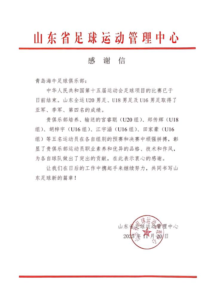 山东省足球运动管理中心给青岛海牛发来感谢信,感谢俱乐部5名球员(其中宫睿聪为外租球员)助力山东全运队。