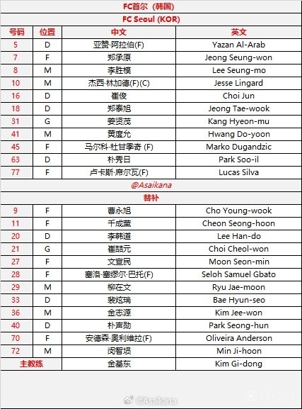 首尔首发:31-姜贤茂、63-朴秀日、18-郑泰昱、5-亚赞-阿拉伯、16-崔俊、7-郑承原、8-李胜模、10-林加德、41-黄度允、45-杜甘季奇、77-卢卡斯-罗德里格斯