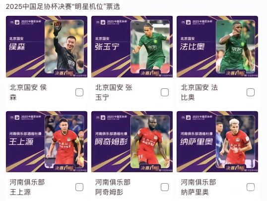 两队各有三名球员进入票选,北京国安是侯森、张玉宁和法比奥,河南队则是王上源、阿奇姆彭和纳萨里奥。