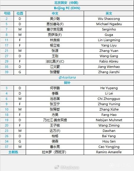 北京国安首发:39-张健智、35-江文豪、2-吴少聪、5-恩加德乌、27-王刚、21-张源、7-塞尔吉尼奥、8-古加、11-林良铭、29-法比奥-阿布雷乌、17-杨立瑜