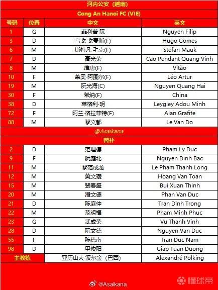 河内公安首发:1-菲利普-阮、38-巴明、7-高光荣、3-乌戈-戈麦斯、88-黎文都、6-毛克、19-阮光海、8-维托、10-莱奥-阿图尔、72-格拉菲特、30-希纳