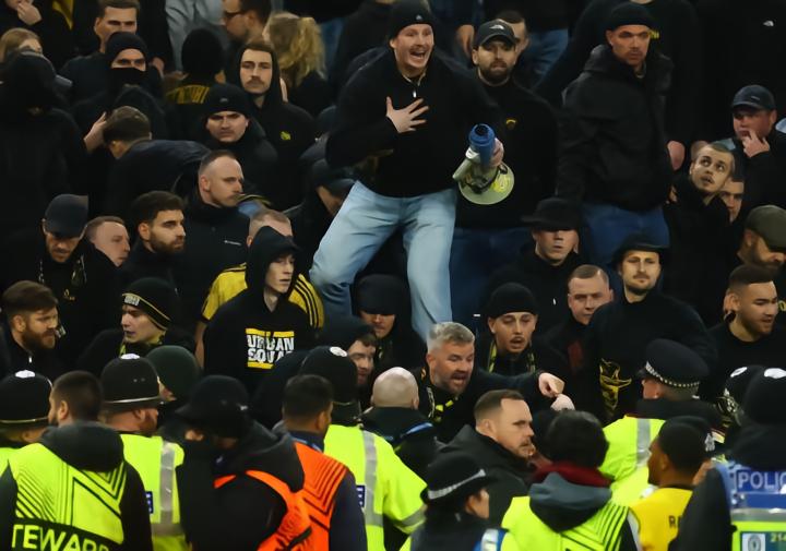 半场结束前三分钟,马伦梅开二度扩大比分,局势进一步恶化。当这位荷兰前锋朝着客队球迷的方向跪地滑行庆祝时,他们的回应是撕扯座椅,与更多塑料杯一起掷向增派的警方和球场工作人员。