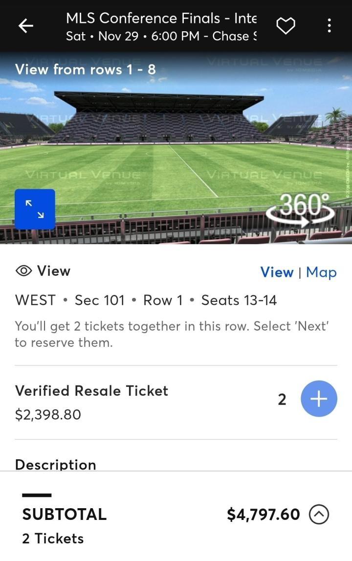 进入迈阿密国际球队官网的购票链接可以发现,迈阿密国际本场比赛的门票价格区间为119美元至960美元之间。