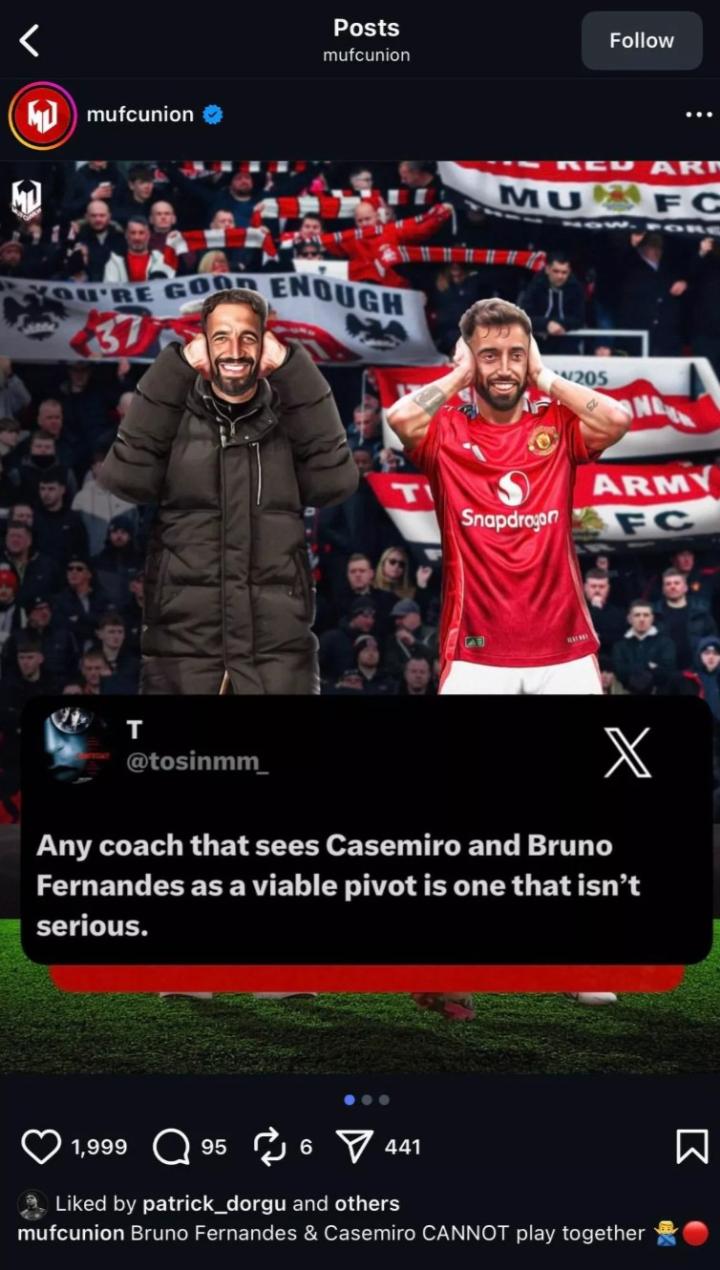 这篇帖子的配文宣称:“布鲁诺-费尔南德斯和卡塞米罗无法一起出场”,并得到了多古的点赞。这位边翼卫今年早些时候以2500万英镑从莱切转会加盟曼联,本赛季在各条战线上出场12次,贡献1次助攻。