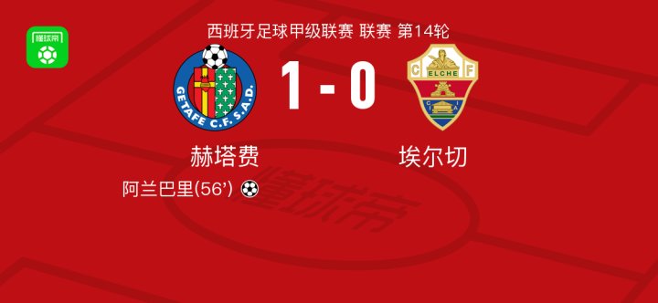 赫塔费1-0埃尔切,阿兰巴里打进全场唯一进球