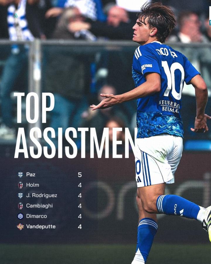 意甲开赛至今,尼科-帕斯打满13场比赛,送出5球5助攻,在射手榜并列首位,在助攻榜独占榜首,是赛季首位直接参与10粒进球的意甲球员。