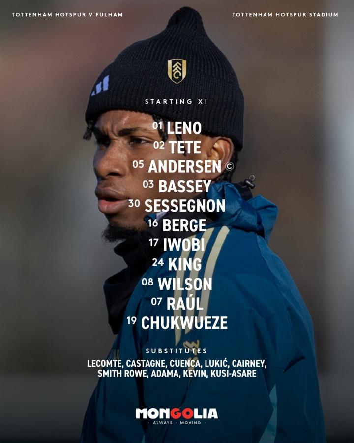 富勒姆首发:1-莱诺、2-泰特、5-安诺生、3-巴锡、30-塞塞尼翁、17-伊沃比、16-贝格、8-哈里-威尔逊、24-乔希-金、19-丘库埃泽、7-希门尼斯