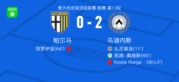 乌迪内斯2-0帕尔马,扎尼奥洛建功,凯南-戴维斯锁定胜局
