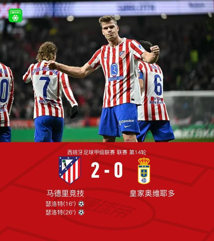 马竞2-0皇家奥维耶多,瑟洛特梅开二度