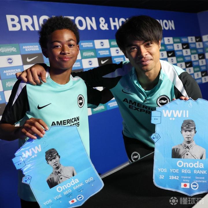 此前,布莱顿足球俱乐部青训学院账号发布了一张照片。照片上一名青训小球员与一线队的日本籍球员三笘薰合影,两人手持类似球员卡的物品,在卡片上印有日本二战时期少尉小野田宽郎的照片。