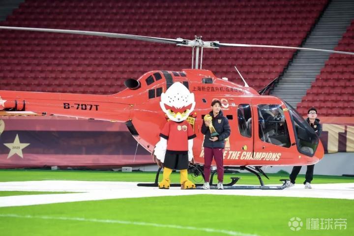 值得一提的是,在11月29日上海海港足球俱乐部举行的赛季总结会中,海港队长王燊超手捧火神杯,坐着同款直升机飞抵球场。