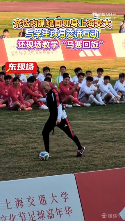 北京时间11月30日,法国足球巨星齐达内与海港球员蒯纪闻现身上海交通大学,与学生球员互动并且现场教学齐达内经典招式“马赛回旋”。