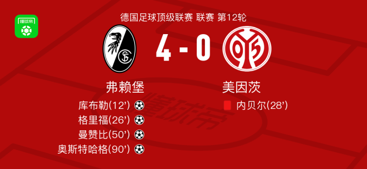 弗赖堡4-0大胜美因茨,奥斯特哈格、曼赞比建功