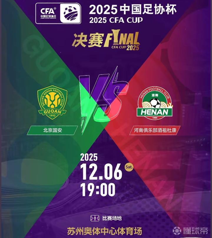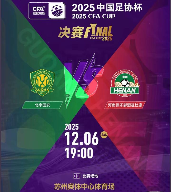 12月6日(本周六)晚19:00,2025中国足协杯决赛,河南队将与北京国安队争夺冠军。