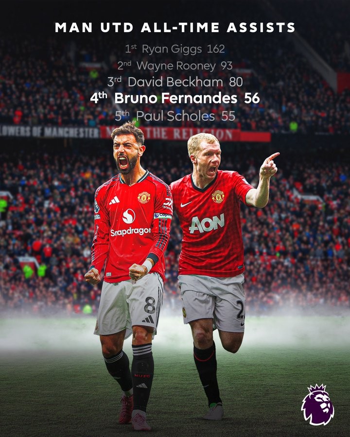 布鲁诺-费尔南德斯代表曼联在英超助攻56次,反超斯科尔斯,升至曼联队史英超助攻榜单第4名。
