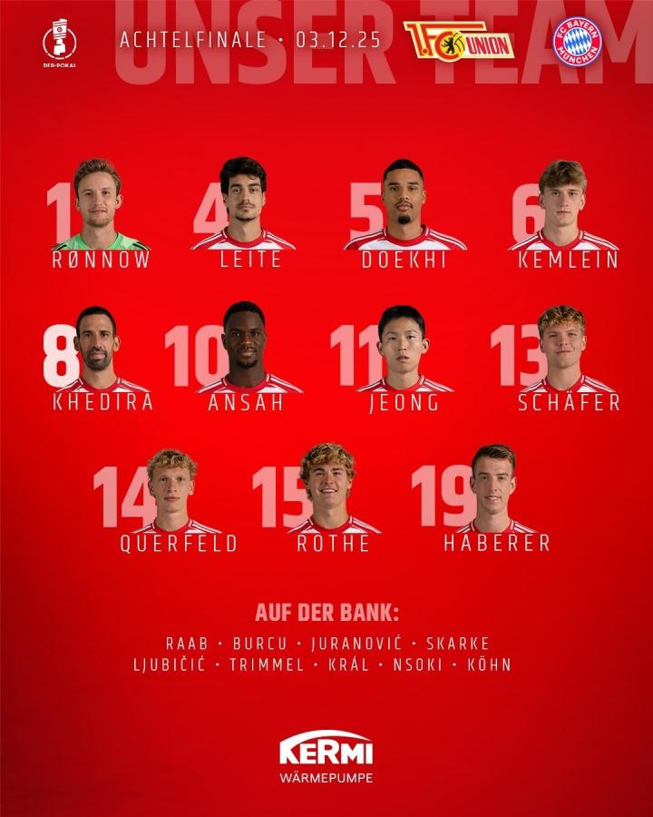 北京时间12月4日凌晨3点45分,德国杯第三轮展开一场焦点战役,拜仁对阵柏林联合。赛前,双方公布首发阵容。