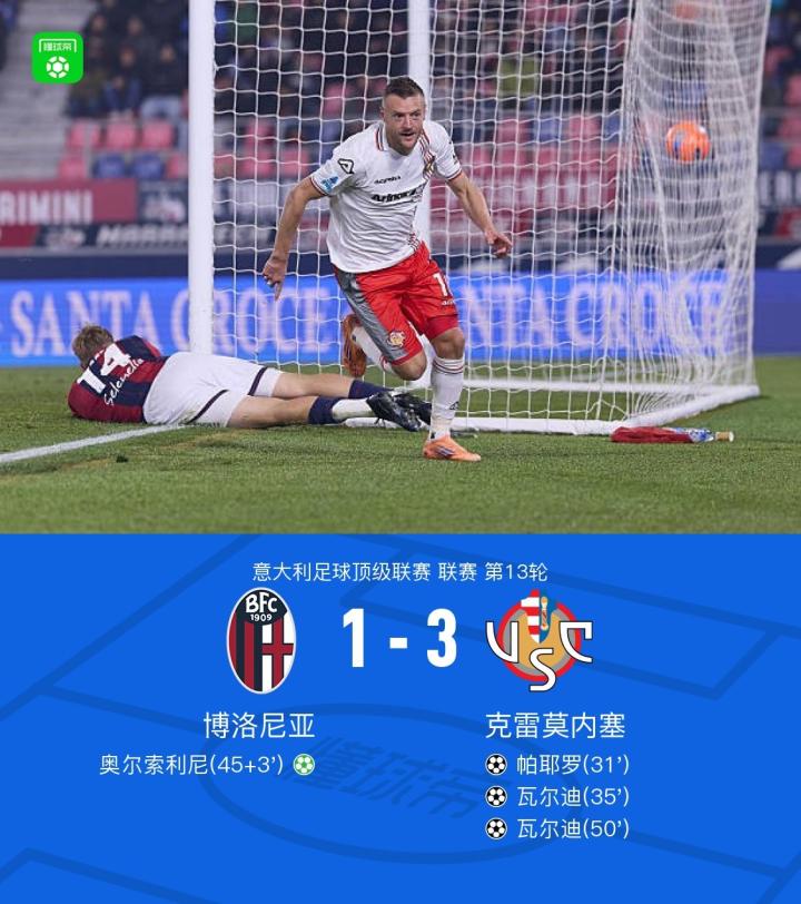 克雷莫内塞3-1博洛尼亚,瓦尔迪双响,帕耶罗破门