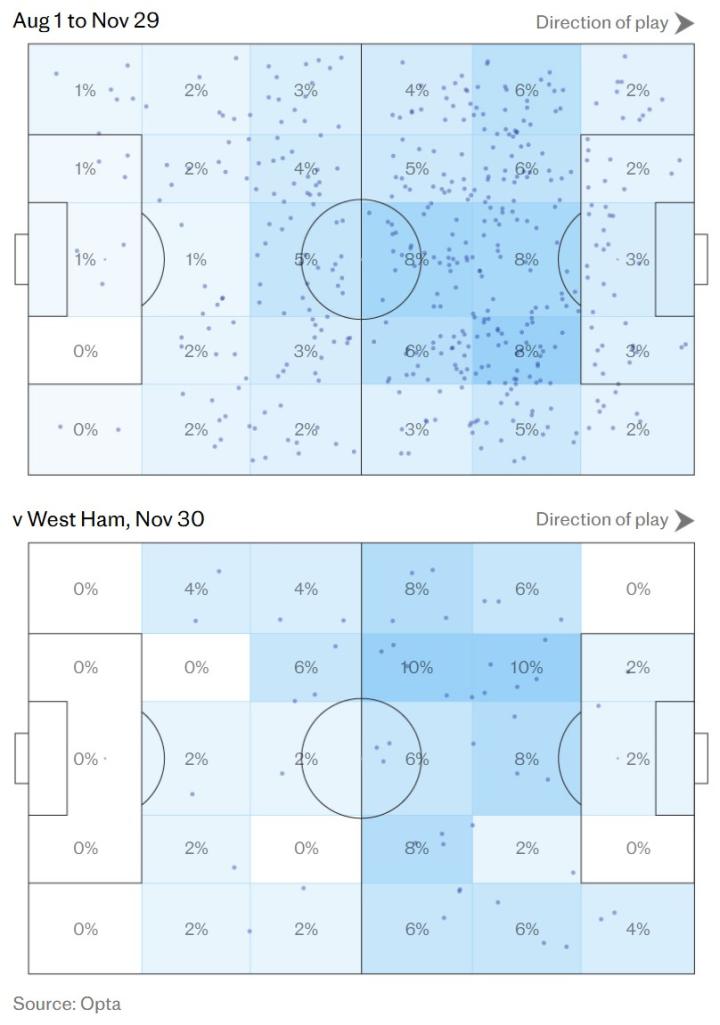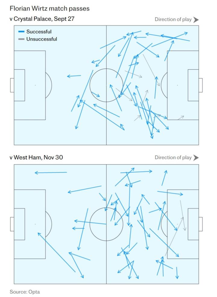 关键在于,本场仅有的两次传球失误,都是尝试传入禁区的“最后一传”,且都险些创造进球。相比之下,十月份对阵布伦特福德时,维尔茨丢球11次,其中5次发生在自家半场。明显的对比是,本场比赛当维尔茨与队友配合时,球队展现出了更强劲、更流畅的向前推进势头。