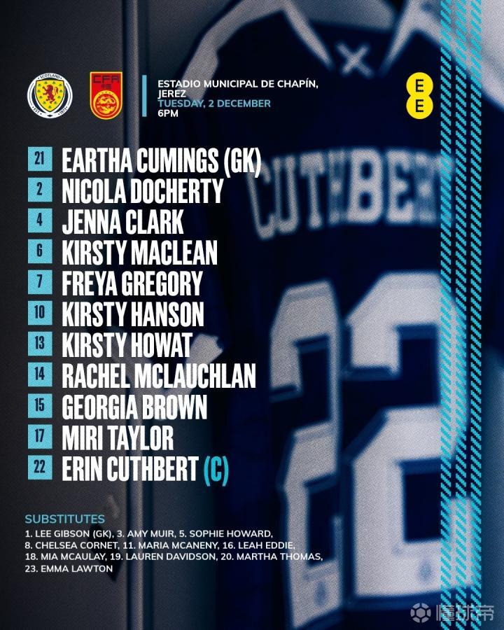 苏格兰女足首发:21-卡明斯、2-多彻蒂、4-詹娜-克拉克、6-麦克莱恩、7-格雷戈里、10-柯丝蒂-汉森、13-豪厄特、14-麦克劳克兰、15-乔治亚-布朗、17-米里-泰勒、22-卡思伯特