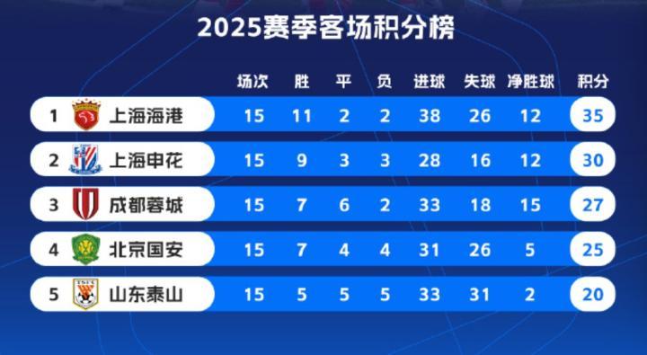 北京时间12月2日,中超官方统计出了2025赛季客场积分排名前五的球队,最终夺冠的上海海港以11胜2平2负积35分的客场成绩高居第一,上海申花5分之差排名第二。