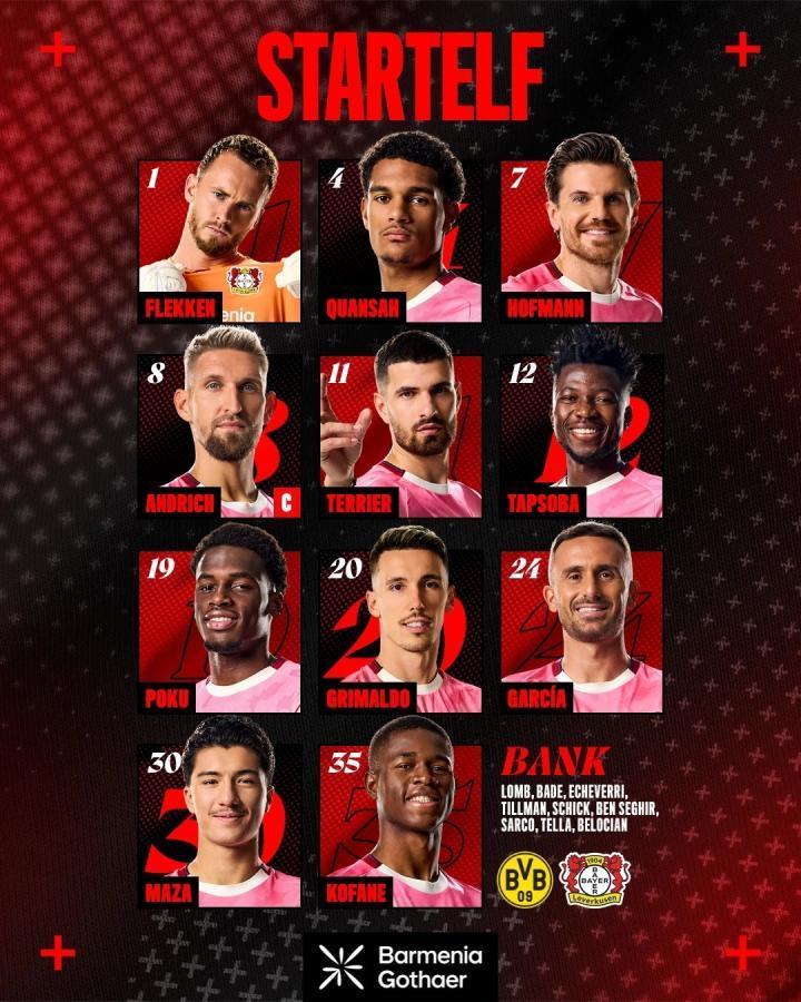 勒沃库森首发:1-弗莱肯、4-夸安萨、12-塔普索巴、20-格里马尔多、7-霍夫曼、8-安德里希、19-波库、24-阿莱士-加西亚、30-马扎、11-泰里耶、35-科法内