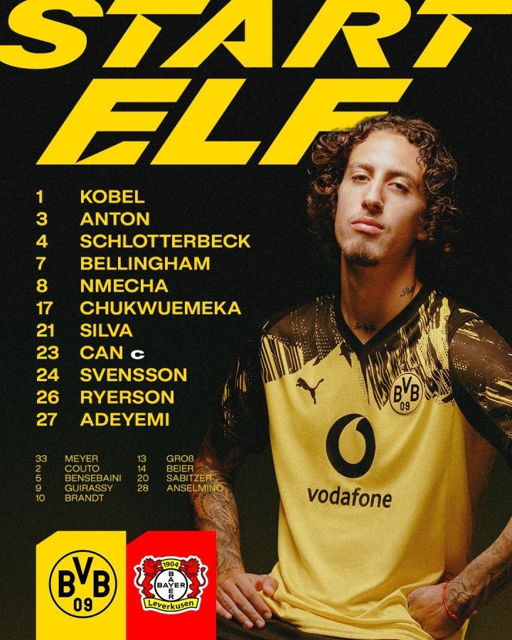 多特首发:1-科贝尔、24-斯文松、3-安东、4-施洛特贝克、26-瑞尔森、7-乔布-贝林厄姆、8-恩梅加、17-丘库埃梅卡、23-埃姆雷-詹、21-法比奥-席尔瓦、27-阿德耶米