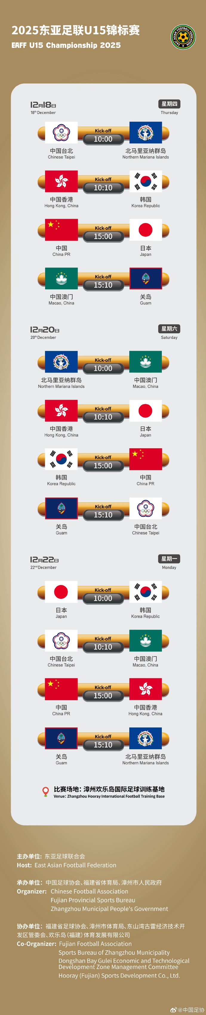 中国足协官方写道:经赛区遴选及东亚足联考察,中国足协现确认漳州市为2025东亚足联U15锦标赛承办城市。2025.12.18-12.22,相约漳州,青春飞扬,为梦想喝彩!
