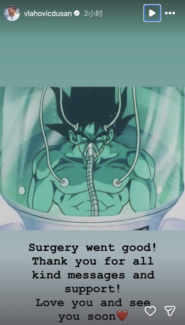 弗拉霍维奇在社交媒体晒出一张《龙珠》角色悟空在治疗舱中恢复的图片,并写道:“手术很顺利! 感谢大家的暖心留言和支持!爱你们,很快再见❤️”
