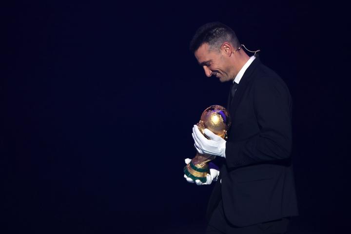 在2022年卡塔尔世界杯上,斯卡洛尼带领阿根廷队赢得了世界杯冠军,在今天的抽签仪式上,他带着大力神杯上台,将奖杯放在了舞台上。
