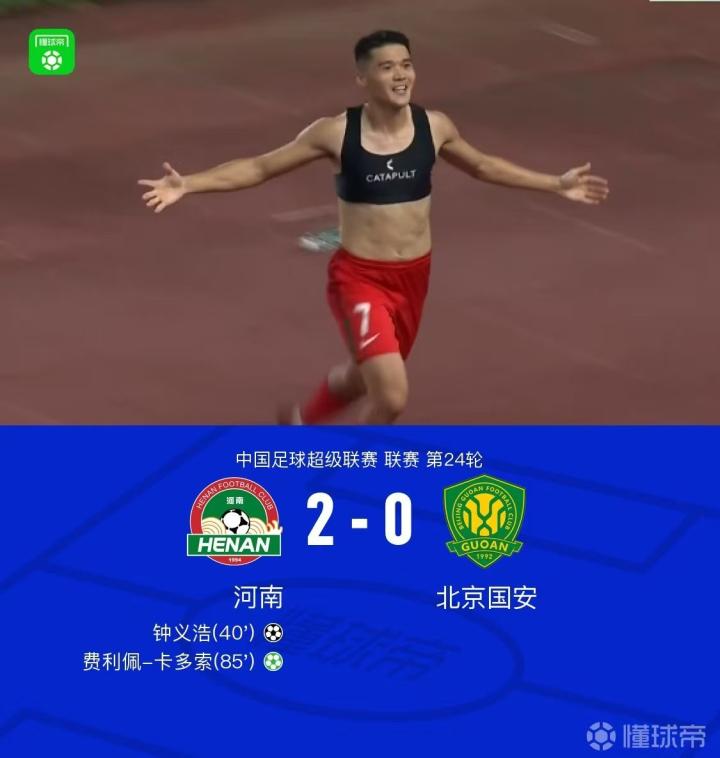 【河南2-0国安,钟义浩百场破门,卡多索点射建功,张玉宁中柱】