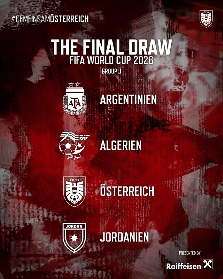 在2026年美加墨世界杯的分组中,奥地利与阿根廷、阿尔及利亚以及约旦一同分在了J组。