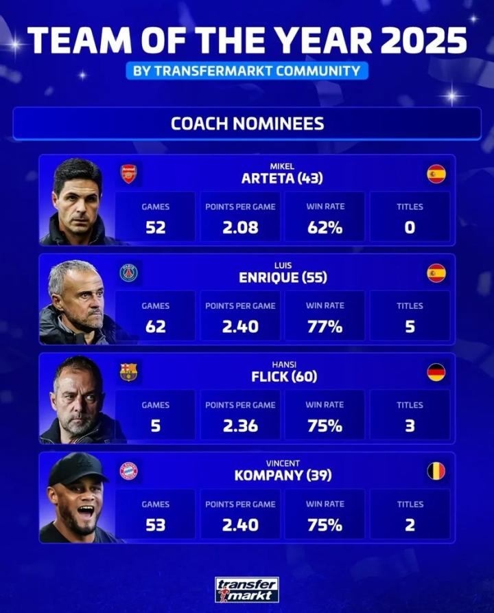 北京时间12月6日,德转列出了年度最佳主帅的四位候选者,阿森纳的阿尔特塔、巴黎圣日耳曼的恩里克、巴塞罗那的弗里克以及拜仁慕尼黑的孔帕尼入围。