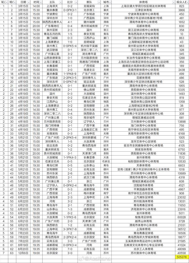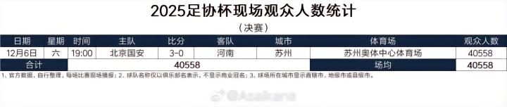 北京时间12月6日晚间,在足协杯决赛结束后,德国转会市场亚洲区管理员朱艺@Asaikana 统计了本赛季足协杯的观众人数。